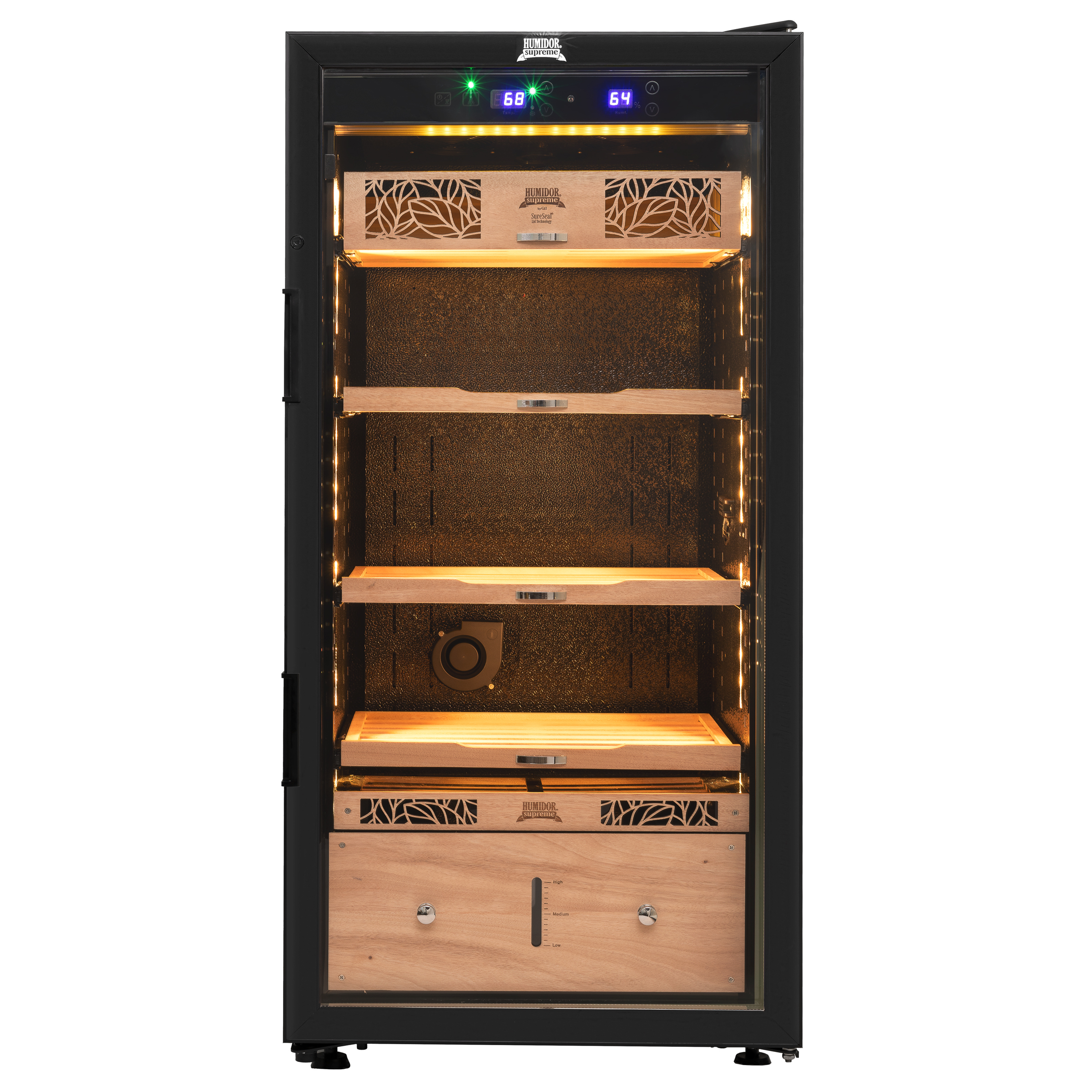 1000-1500 Cigar Storage Capacity * Double Pane UV- Protected Glass Door * 3 Spanish Cedar Pull-out Shelves For Cigar Box Storage * 1 Pull-out Shelf Drawer With Divider For Loose Cigars * Self Regulating Digital Temperature & Humidity Control Panel * Interior Integrated With LED Lighting * 2 Recessed Handles * Door Lock & Key Set * Air-cooling Circulation * Adjustable Leveling Feet * Smooth Black Xikar Exterior Finish * 1 Year Warranty * Low Maintenance - Clean Once Every 2 Months * Fill With Distilled Water